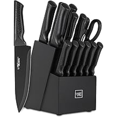 Knife Set, 15 Pcs Kitchen Knife Set with Block Self Sharpening, Dishwasher Safe, 6 Steak Knives, Anti-slip handle, Black